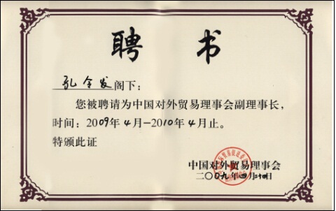 2009年孔董事長榮聘為中國對外貿(mào)易理事副理事長